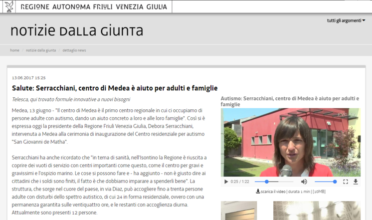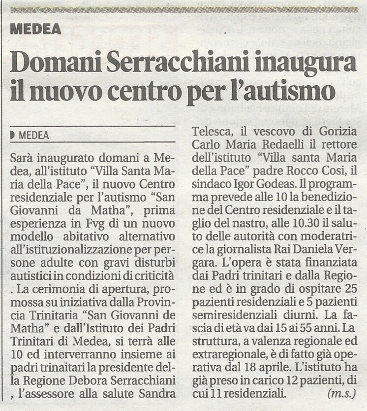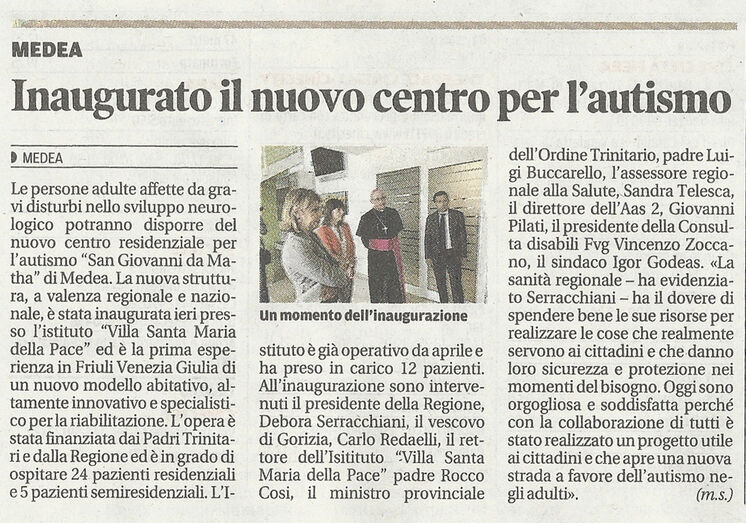 Il 13 giugno 2017 abbiamo inaugurato il nostro nuovo Centro per L'Autismo (CRA) "San Giovanni de Matha" che rappresenta la prima esperienza nella regione Friuli Venezia Giulia di un nuovo modello abitativo, alternativo all'istituzionalizzazione, per persone adulte con autismo in condizioni di criticità e permette di organizzare servizi ed attività con un forte orientamento sperimentale di comunità, sulla base delle esperienze europee maturate con le farm-community per persone autistiche.