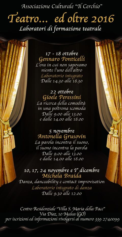L'associazione culturale "Il Cerchio" organizza alcuni laboratori di formazione teatrale, che si terranno presso il Centro Residenziale "Villa S. Maria della Pace" di Medea. Per i dettagli consultate la locandina.