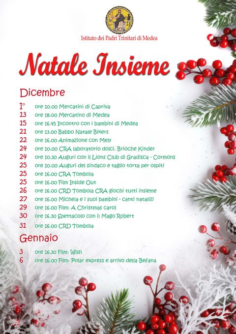 L'Istituto dei Padri Trinitari di Medea augura a Voi e alle Vostre Famiglie i più sinceri Auguri di Buone Feste per un Natale assieme Vi invita a partecipare agli eventi in programma.